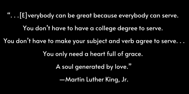 “If you want to be important—wonderful. If you want to be recognized—wonderful. If you want to be great—wonderful. But recognize that he who is greatest among you shall be your servant. That’s a new definition of greatness. By giving that definition of greatness, it means that everybody can be great because everybody can serve. You don’t have to have a college degree to serve. You don’t have to make your subject and your verb agree to serve. You don’t have to know about Plato and Aristotle to serve. You don’t have to know Einstein’s theory of relativity to serve. You don’t have to know the second theory of thermodynamics in physics to serve. You only need a heart full of gracea soul generated by love. And you can be that servant.” – Rev. Dr. Martin Luther King Jr.